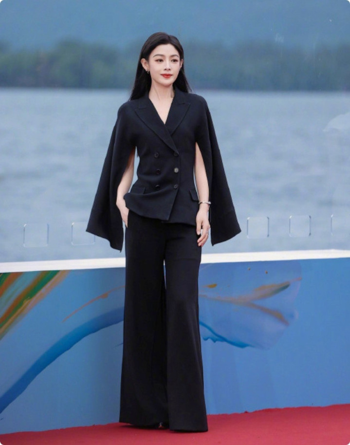 她以一袭黑色西装造型亮相,干练大方,气场全开。